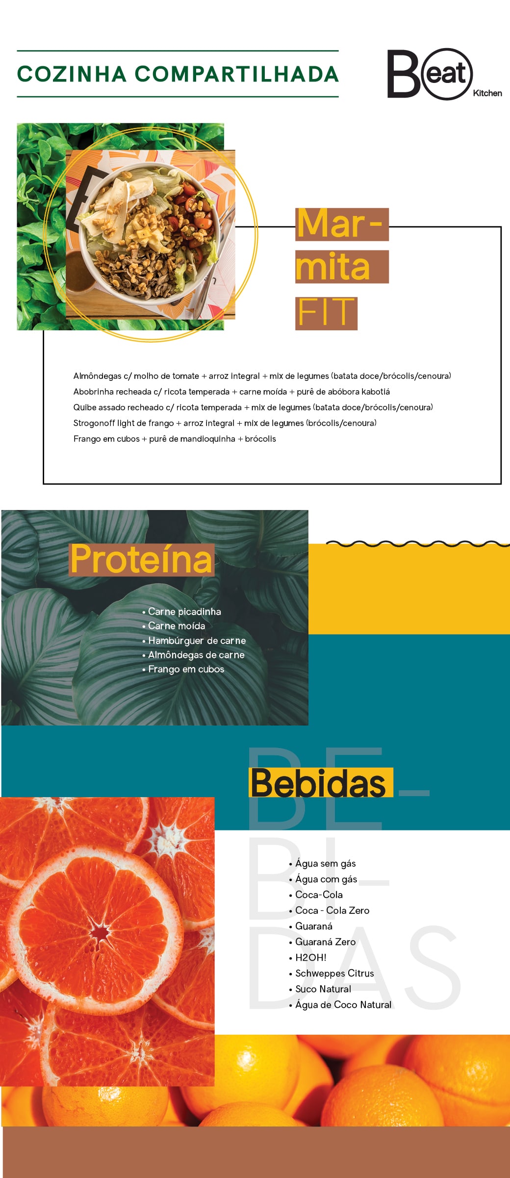 Geladeiras com bebidas, sucos naturais, marmitas e proteínas prontas para o consumo.